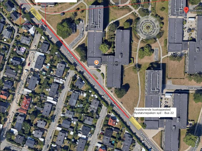I forbindelse med nedrivning af kælderen mellem Rønnebo og tidligere Poppelbo er det nødvendigt at flytte busstoppestedet ‘Bystævneparken syd’. Busstoppestedet flyttes ca. 175 meter til demenscentret Pilehuset på adressen Bystævneparken 24. Du kan se præcist hvor på fotoet. Flytningen sker forventeligt i uge 46.