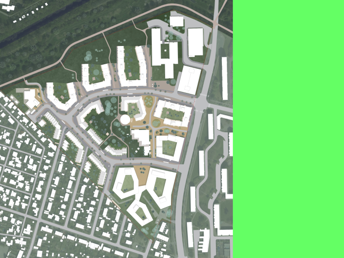 Illustrationsplan, der viser den nye bebyggelsesplan for lokalplanområdet samt eksempler på nybyggeri i overensstemmelse med lokalplanen.